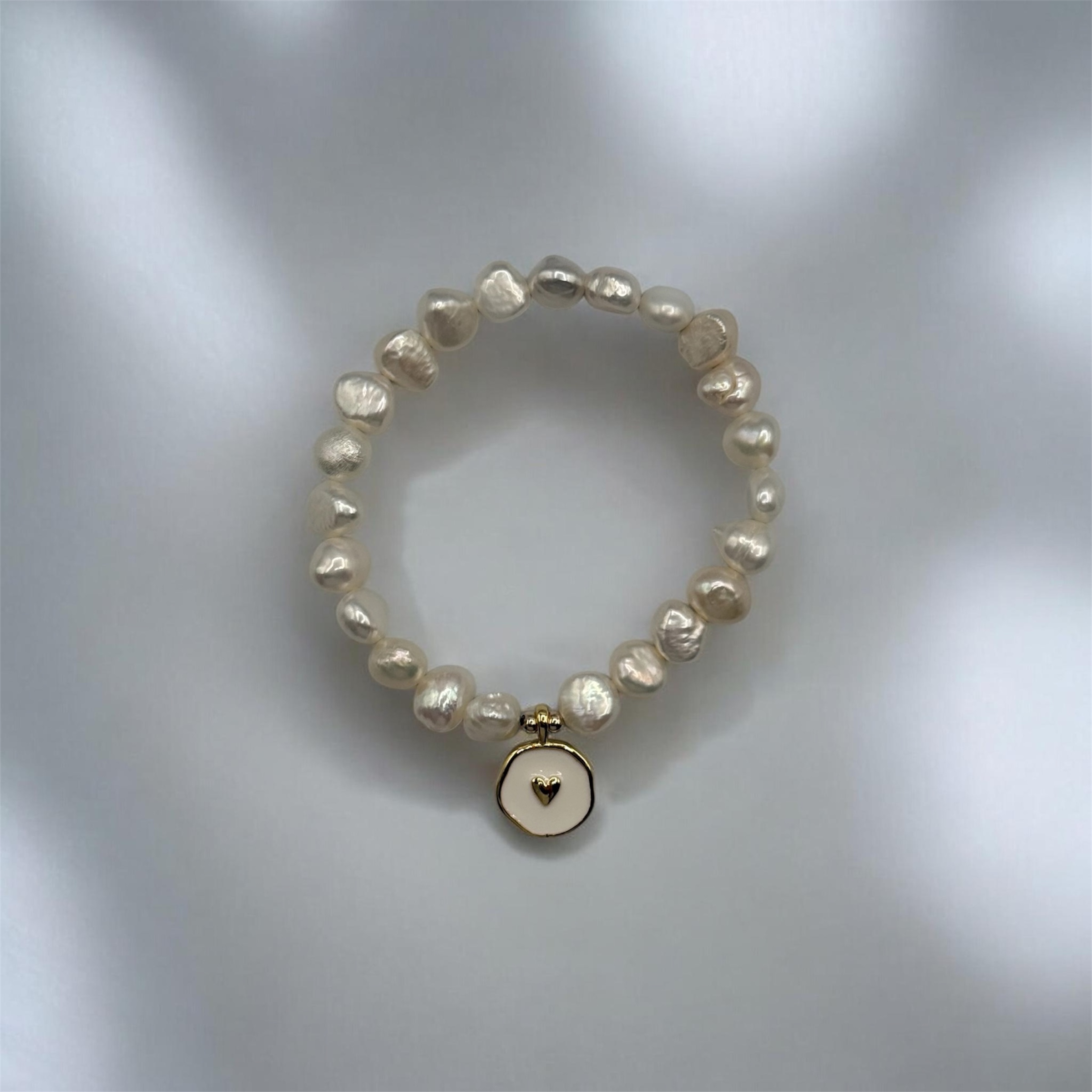 8mm white pebble pearl on elastic with a white enamel and petite gold heart charm.