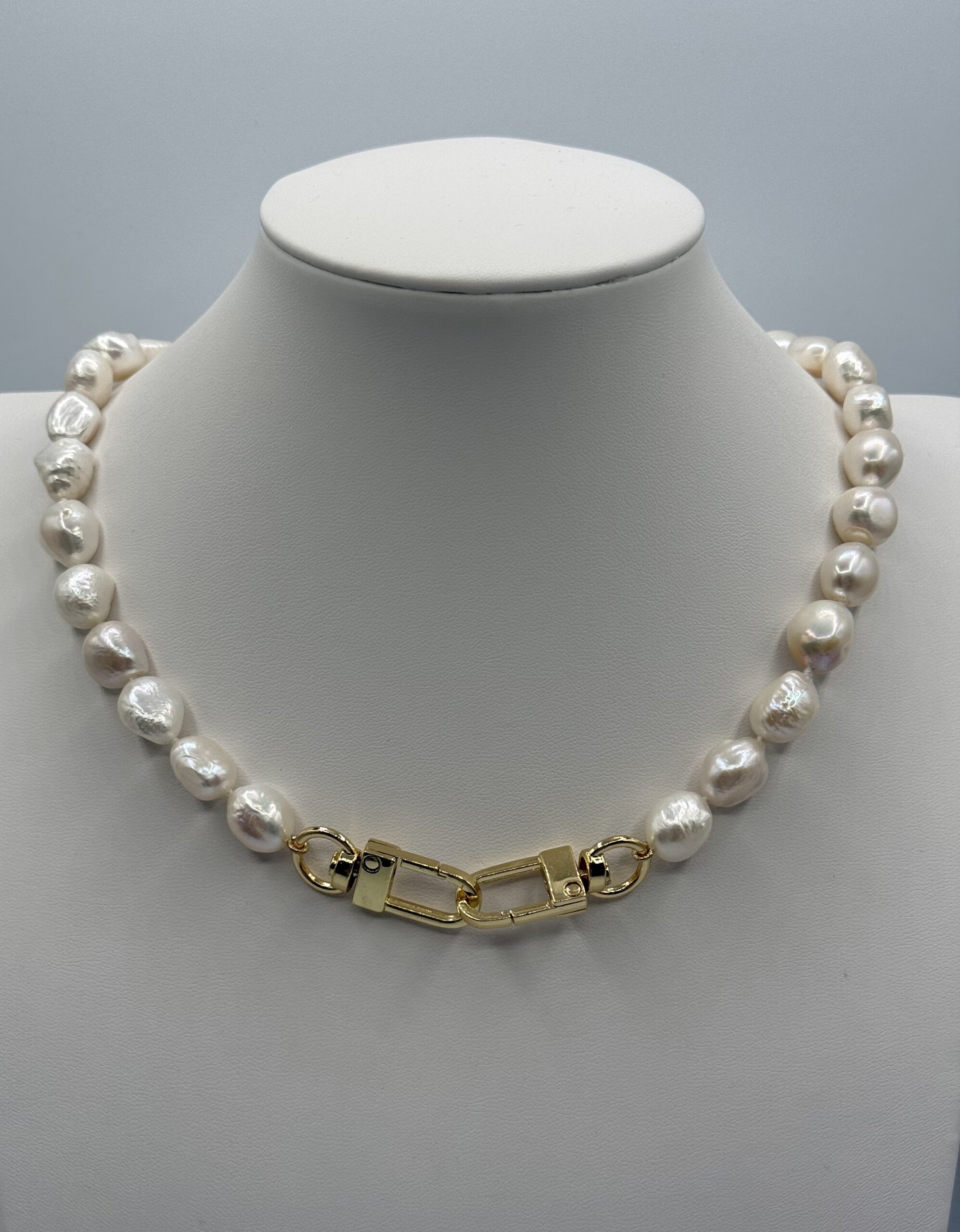 Statement necklaces are back! This necklace has 10-11mm white, pebble, freshwater cultured pearls connected with two large 18 kt. gold plated swivel snap clasps.